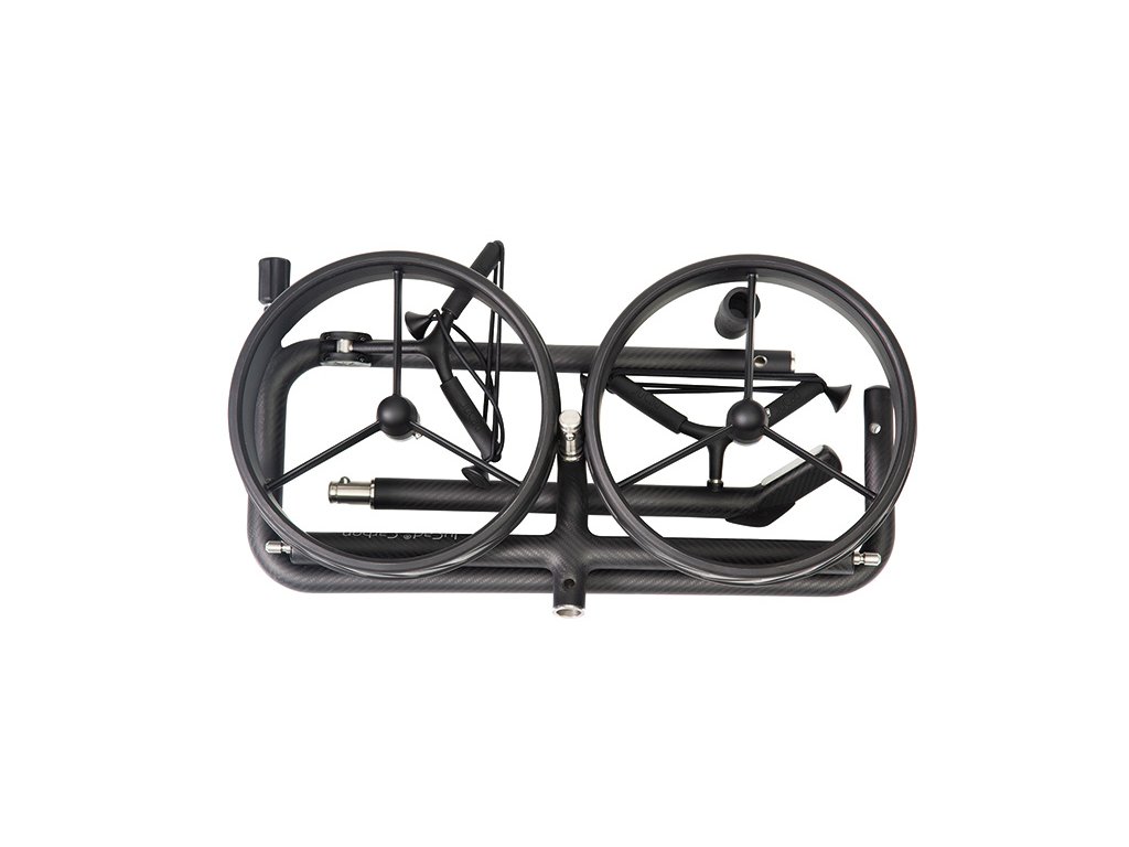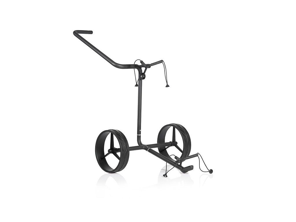 Lehký karbonový rám (frame + kola ~4 kg) s matným „3K“ povrchem, bez omezení hmotnosti bagů.Výškově nastavitelná rukojeť, umožňuje tlačit i tahat vozík v ergonomické poloze.
